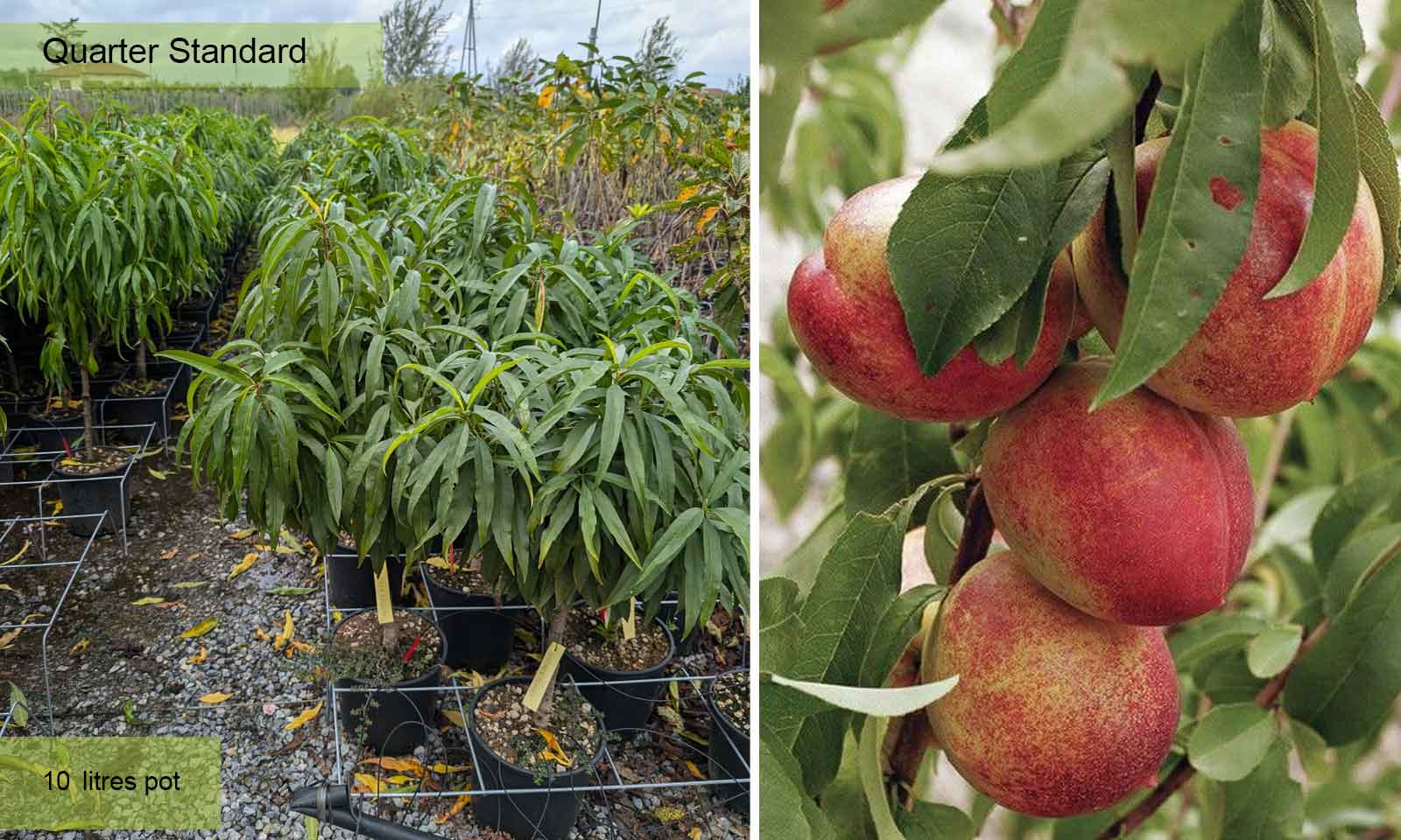 It is a compact, self-fertile fruit tree that produces sweet, juicy nectarines and is ideal for patios and small spaces. The Garden Beauty has deep pink, semi-double flowers in the spring and yellow fleshed fruits in the summer. Dwarf cultivars like the Garden Beauty need little or no pruning.