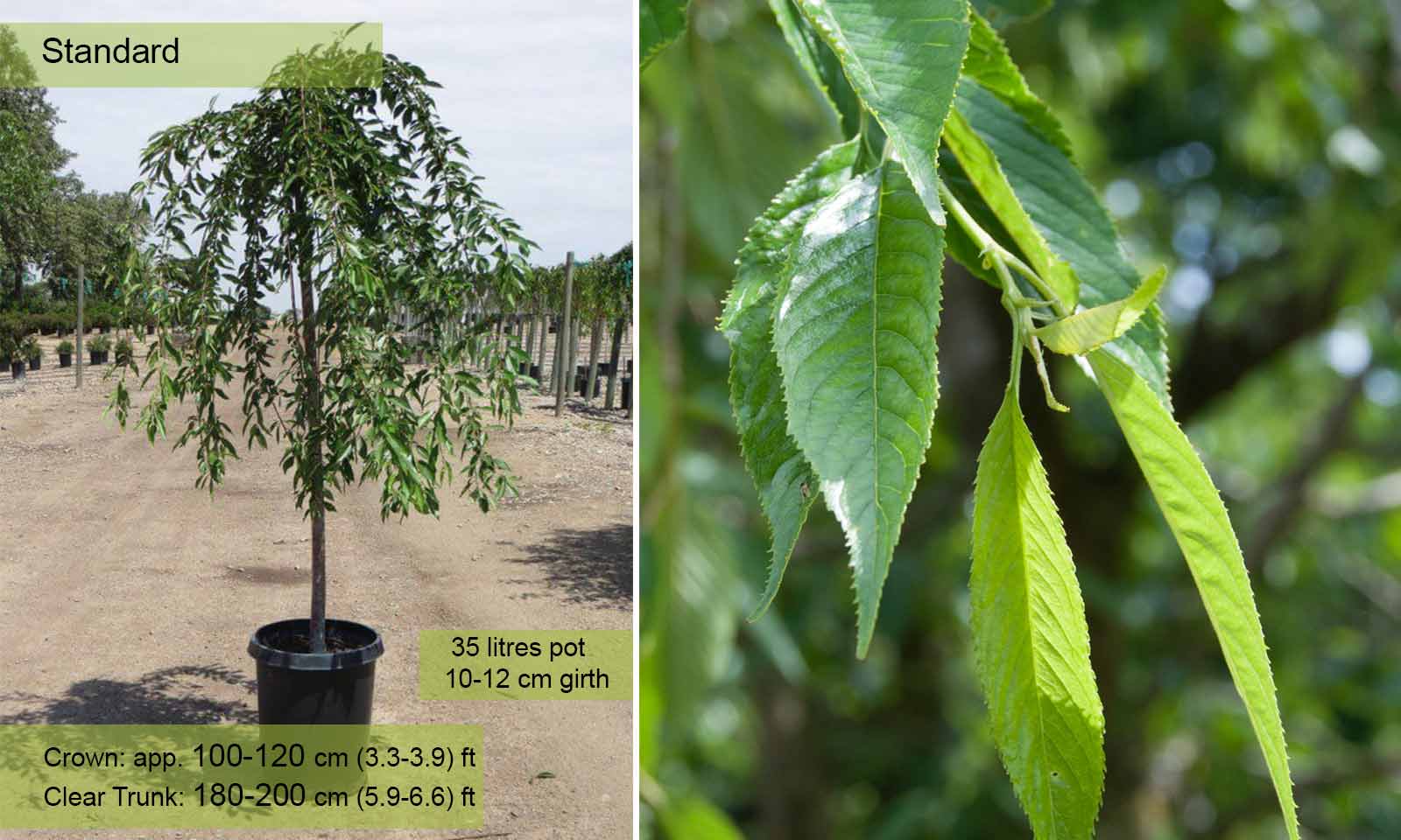 Small deciduous tree top grafted. From the point of the grafting the long main branches initially spread out and then hang down at the ends. The secondary branches weep until they almost touch the ground. Deciduous leaves, oval, toothed, dark green turning a beautiful yellow or red in autumn. Flowers in March-April, before the leaves, crimson when in bud, bright-pink when open, which cover the whole length of the branch. No particular requirements as regards soil providing it is well-drained and not stagnant.