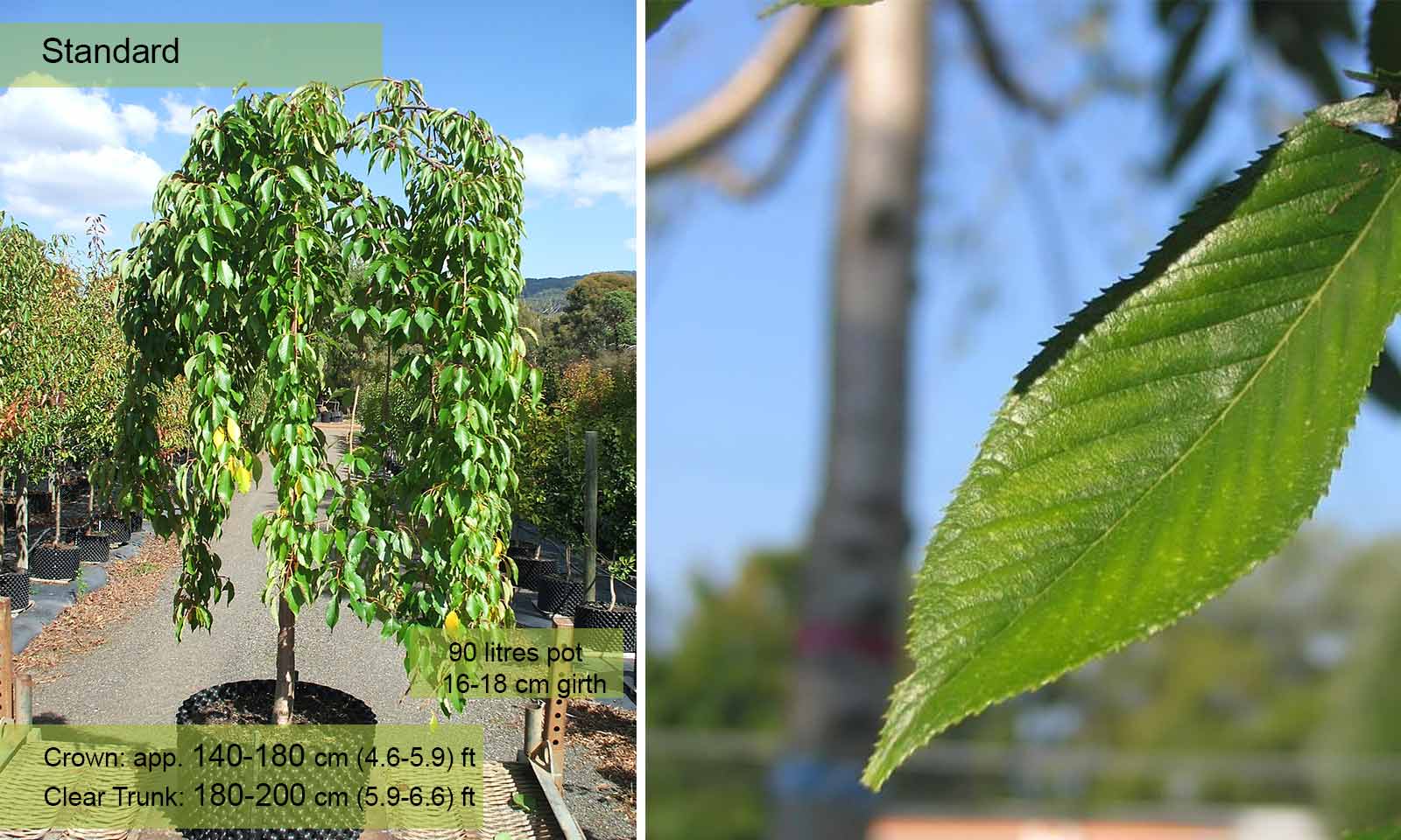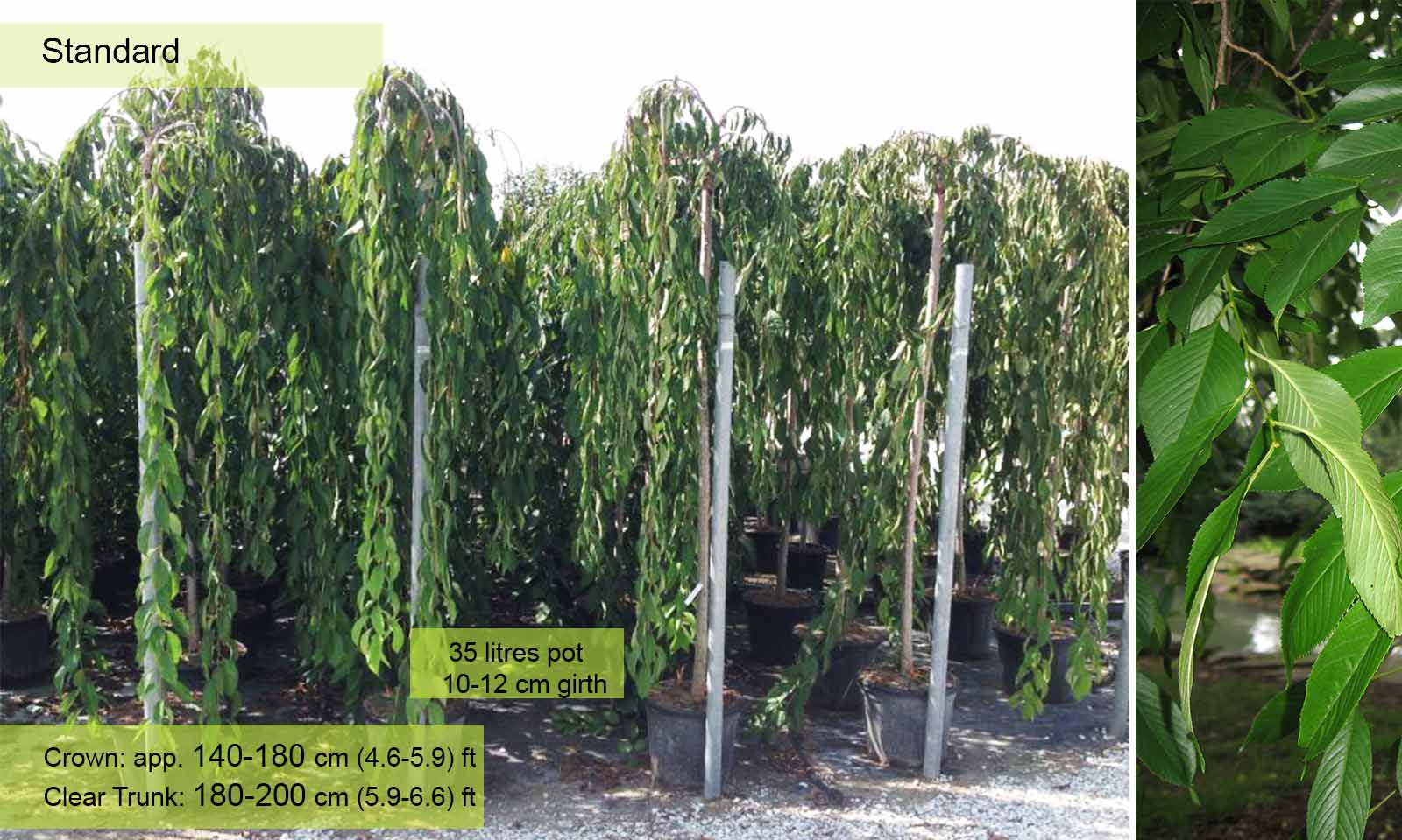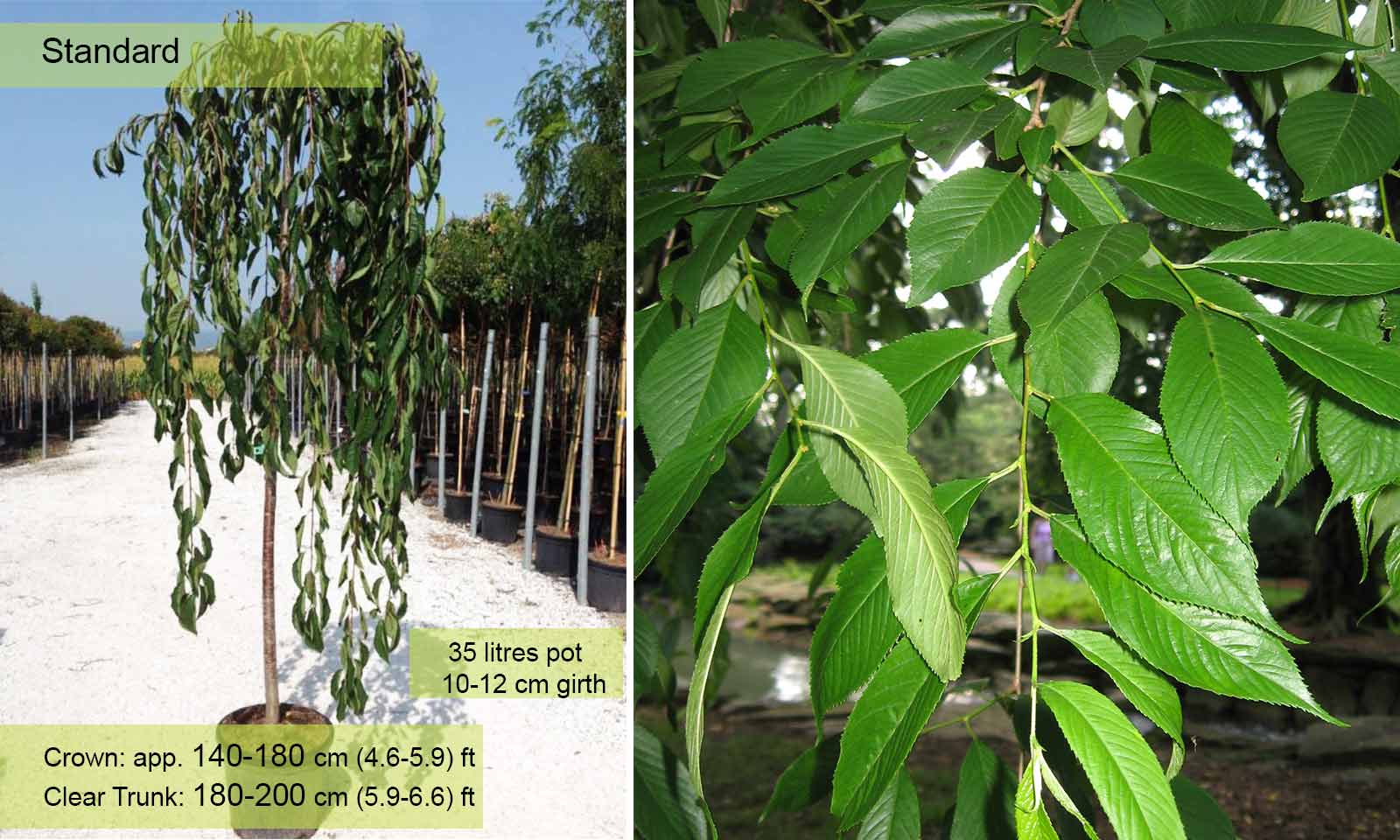 Small deciduous tree top grafted. From the point of the grafting the long main branches initially spread out and then hang down at the ends. The secondary branches weep until they almost touch the ground. Deciduous leaves, oval, toothed, dark green turning a beautiful yellow or red in autumn. Flowers in March-April, before the leaves, crimson when in bud, bright-pink when open, which cover the whole length of the branch. No particular requirements as regards soil providing it is well-drained and not stagnant.