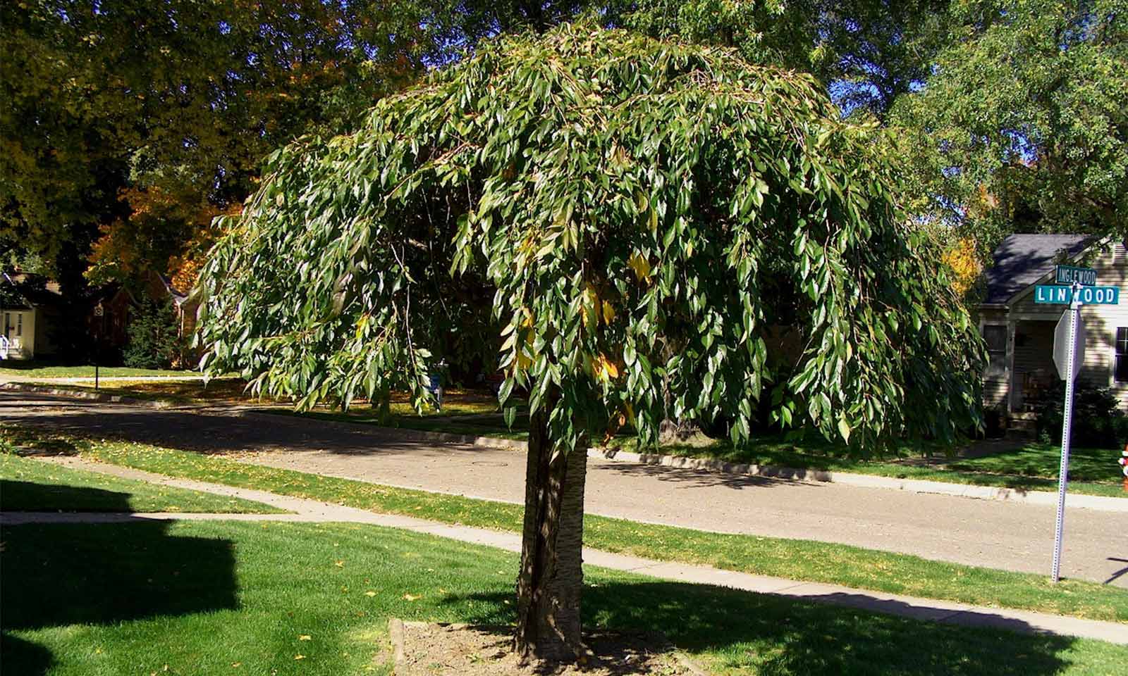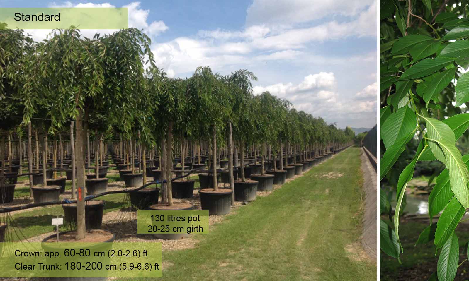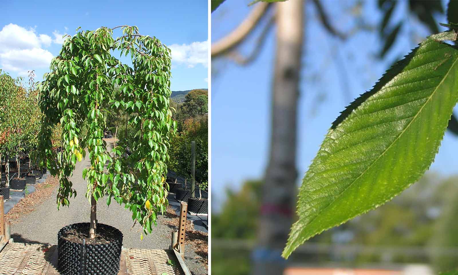 Small deciduous tree top grafted. From the point of the grafting the long main branches initially spread out and then hang down at the ends. The secondary branches weep until they almost touch the ground. Deciduous leaves, oval, toothed, dark green turning a beautiful yellow or red in autumn. Flowers in March-April, before the leaves, crimson when in bud, bright-pink when open, which cover the whole length of the branch. No particular requirements as regards soil providing it is well-drained and not stagnant.