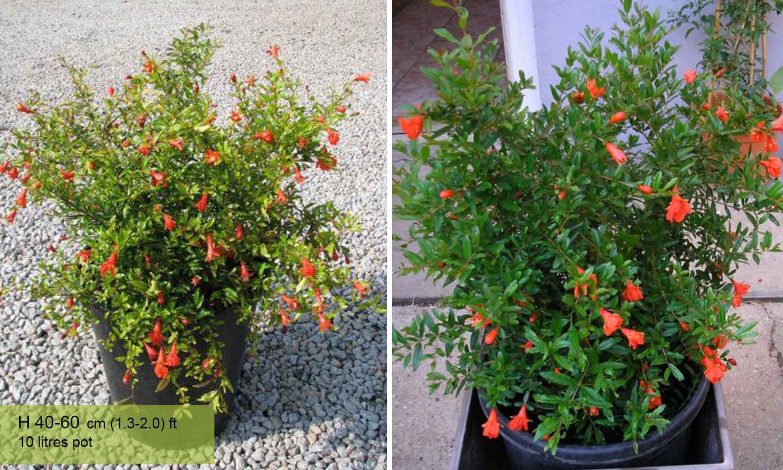 Dwarf Punica Granatum – extremely attractive little flowering shrub with fruits from August to November. The young leaves are coppery-red and change to bright green and then golden yellow in autumn. Orangey-yellow fruit from August to November. Ideal plant for balconies and patios.