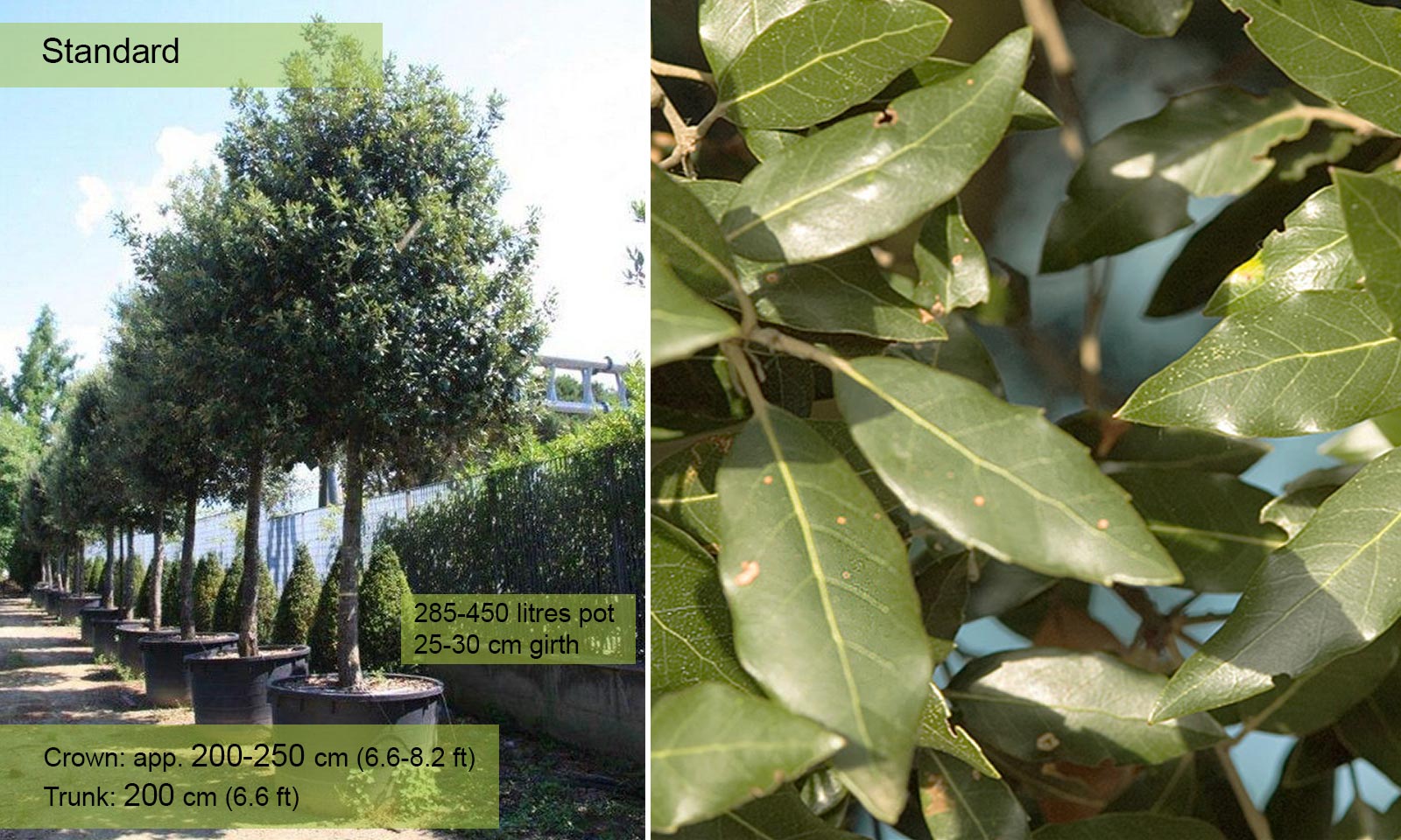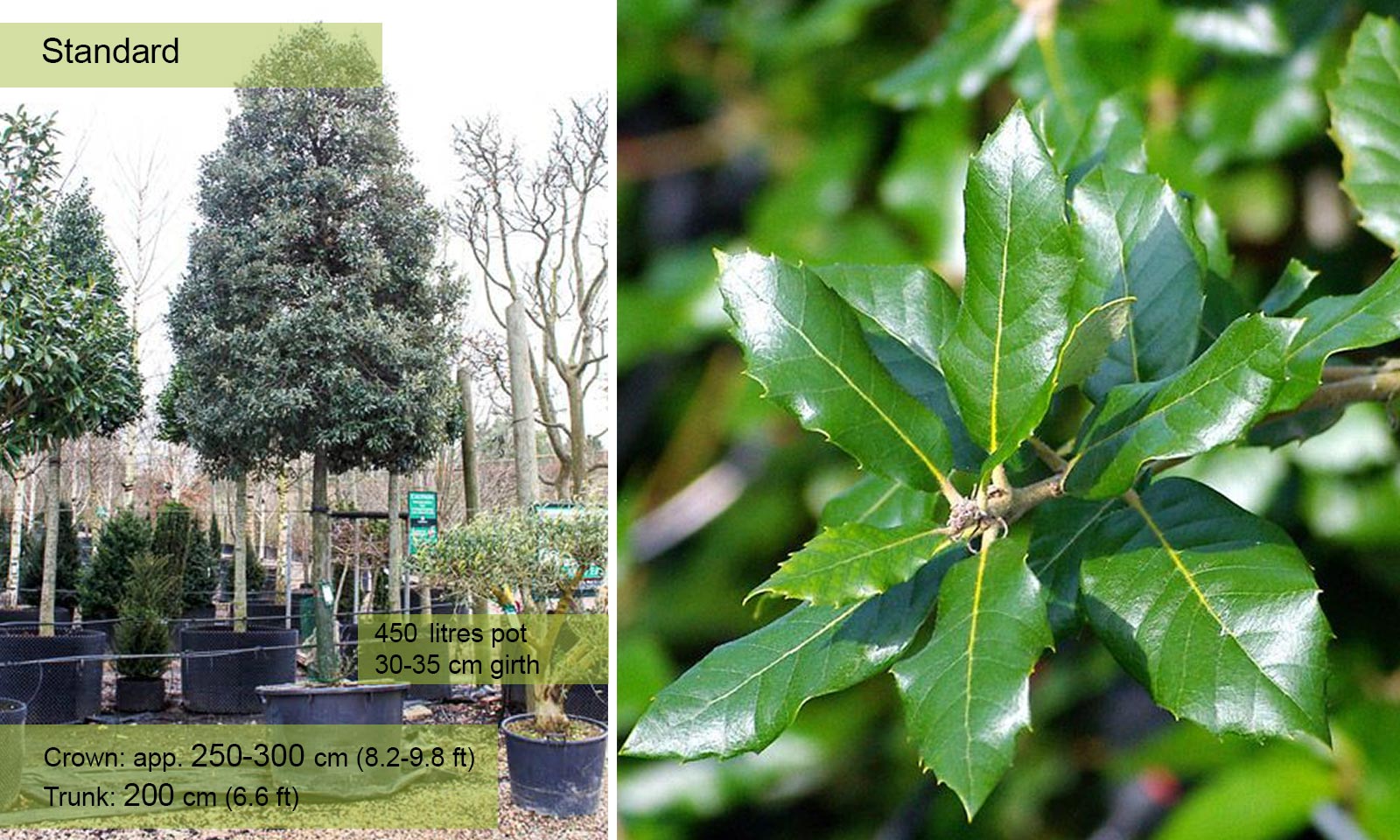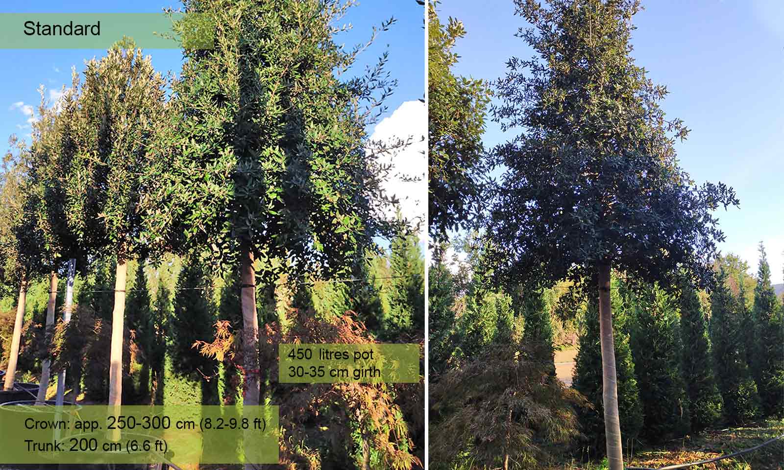 Girth 30-35 cm: 450 litre pot, trunk – 200 cm (6.6 ft), crown – 250-300 cm (6.6-8.2 ft);