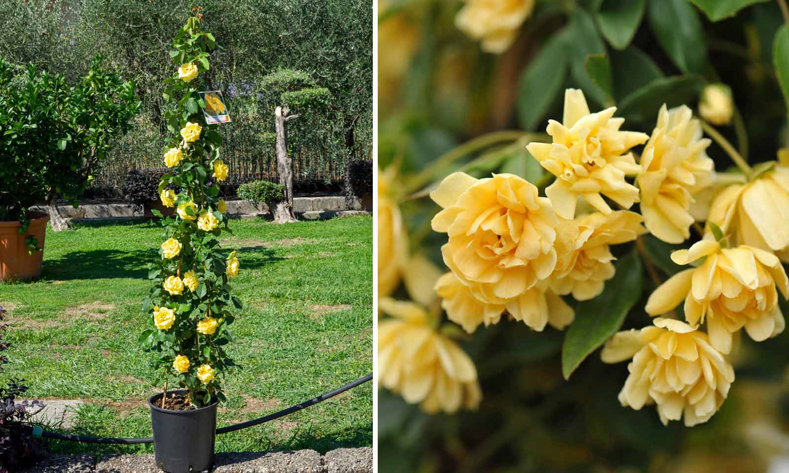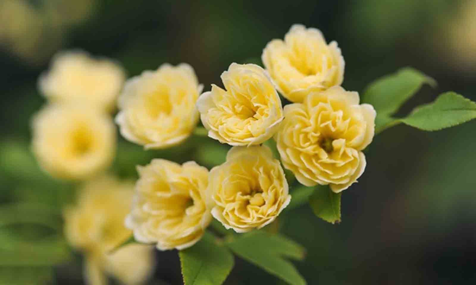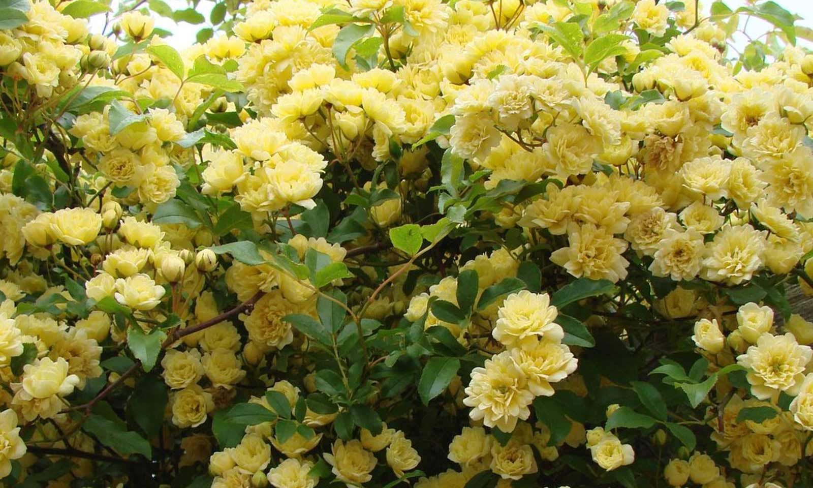 A thornless climbing rose that produces clusters of small yellow double-petalled flowers.