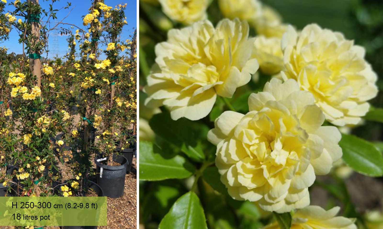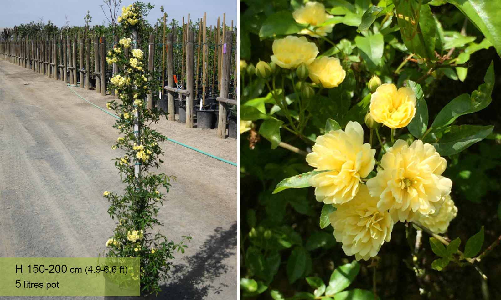 The Yellow Banksian Rose is a semi-evergreen – meaning it can retain its green leaves and stems if sheltered from the worst of the British winter. You should also provide a moisture-retentive soil and an annual winter mulch of well-rotted manure to ensure the richness of colour when its flowers bloom in the spring. Yellow Banksian Roses are excellent climbers when trained (tied) to trellises or frames.