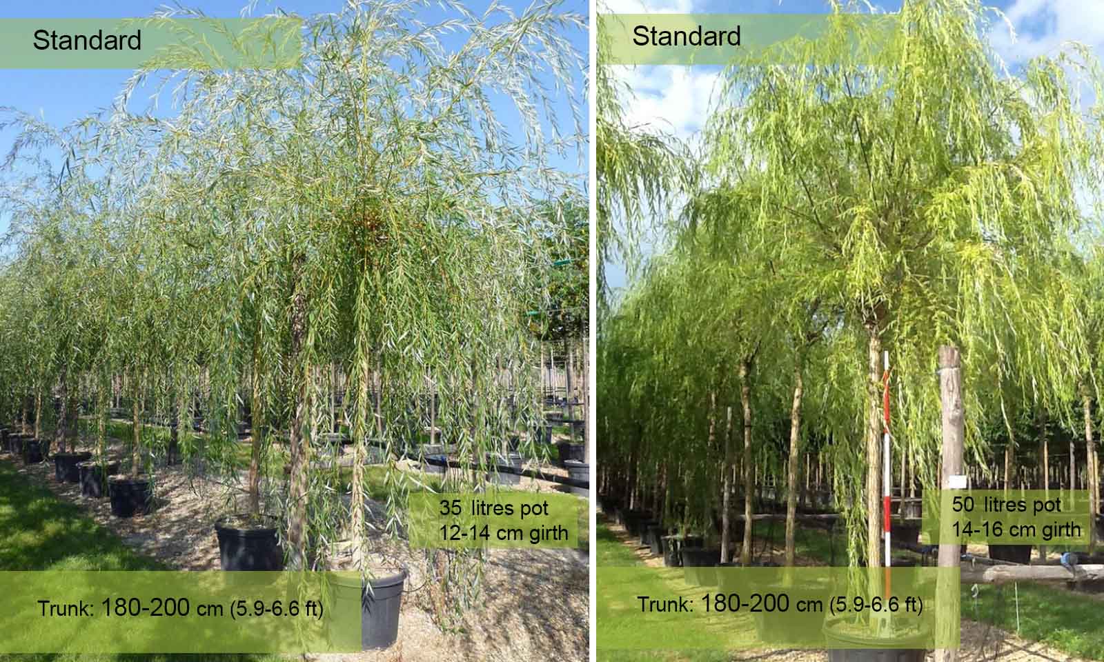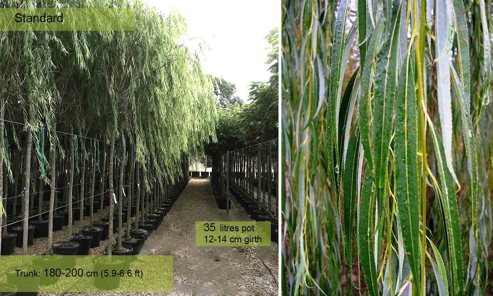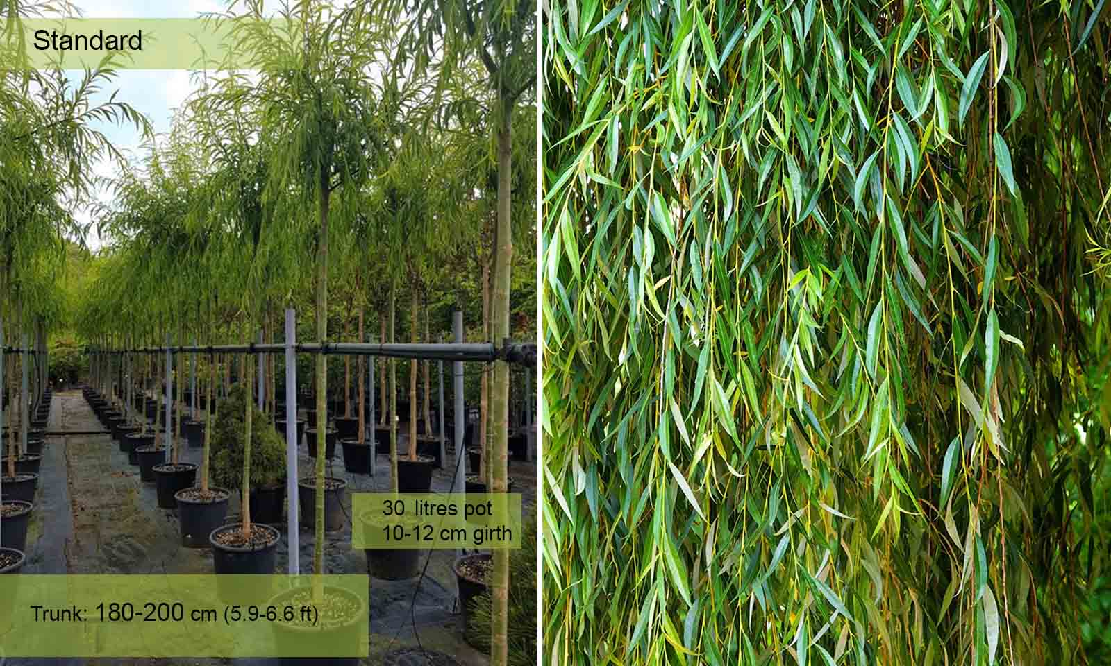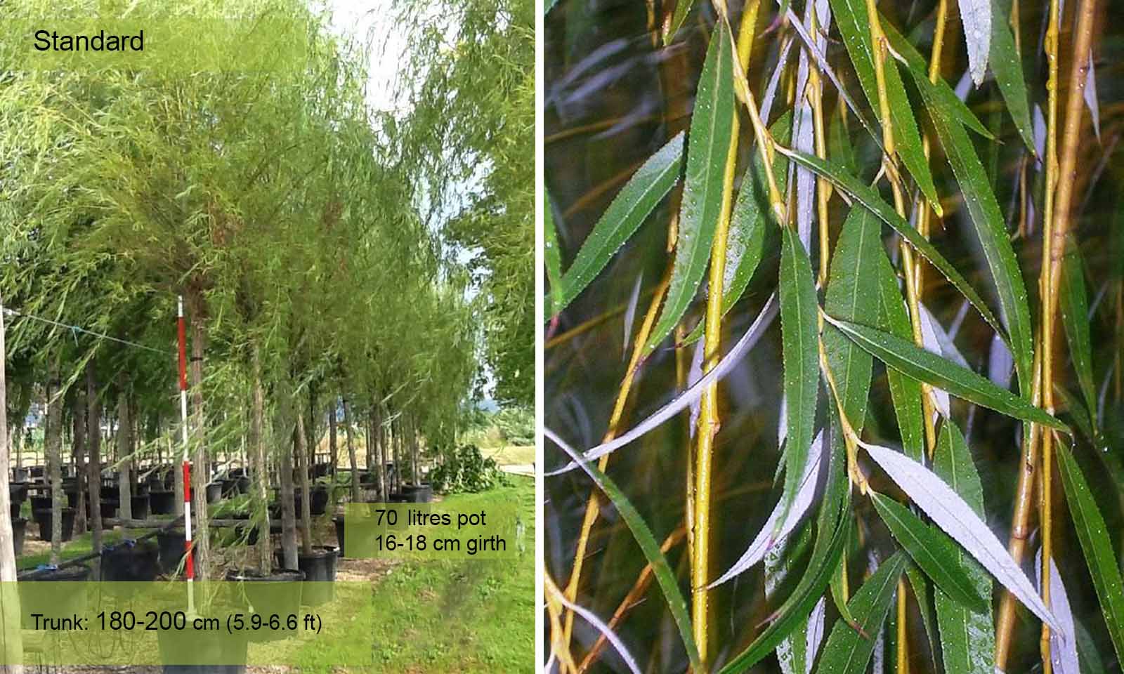The most ‘weeping’ of all deciduous trees. The crown is formed from strong main branches which bow down at the ends forming arches that overlap one another; numerous secondary branches, green, thin, weeping. A picturesque, impenetrable, green cascade that reaches the ground. Leaves and flowers appear at the same time. The leaves are lanceolate, linear, 7 – 12 cm long and a little over 1cm wide, pale green on the upper side, greyish-green underneath. The flowers are green, pendulous catkins, 2 – 3 cm long, only visible close up. Requires moist soil, preferably calcareous or clay, and full sun. This is a fast grower effective in groups or alone. The plant itself is prone to pests and diseases so take care in maintaining. Stick to pruning group 1 for caring for this plant. With a hardiness rating of H5, this plant is perfect for the British climate and only should be sheltered in extreme cold scenarios.
