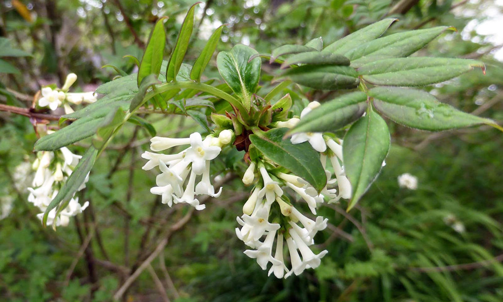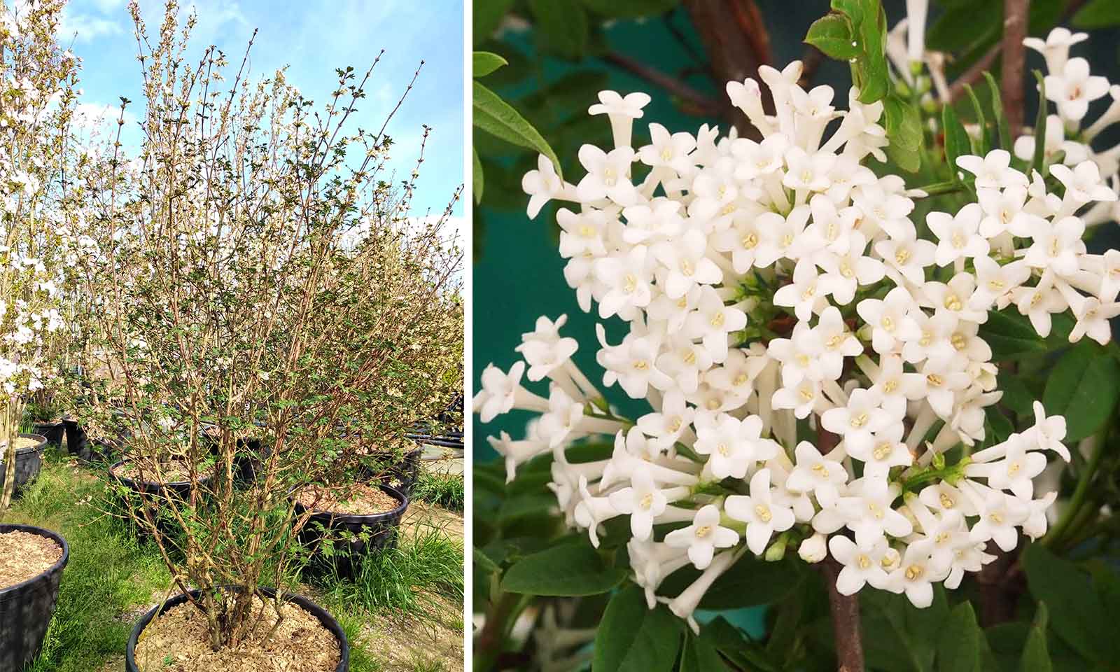 Syringa Pinnatifolia – open, upright shrub with peeling bark on older branches. The leaves resemble a miniature ash, just 6 cm long, with up to 11 dark green leaflets. Fragrant, lilac-flushed, tubular, white flowers appear in open clusters in late spring.