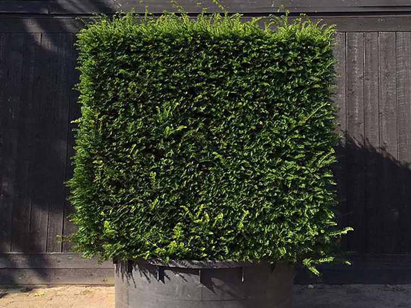 An impressive cube topiary grown from Taxus Baccata (English Yew). The slow growth rate of English Yew means an added advantage as yew topiary only needs to be clipped once a year in late summer to maintain its shape. Taxus Baccata – conifer with main horizontal branches and secondary branches short and weeping. If left to grow freely and if it has enough space it will become a broadly conical tree with spreading, horizontal branches. Male cones are yellow in spring, followed by beautiful red fruit. Grows well in fertile, well drained soil including chalky and acid soil.