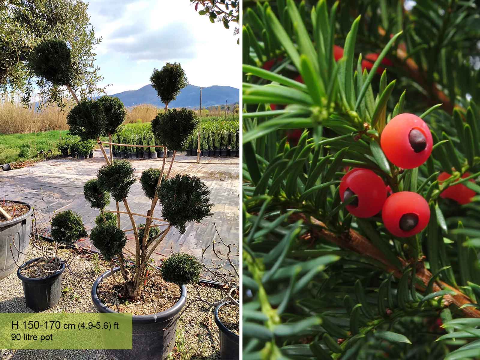 An impressive pom pon topiary grown from Taxus x Media ‘Hicksii’- conifer with main horizontal branches and secondary branches short and weeping. If left to grow freely and if it has enough space it will become a broadly conical tree with spreading, horizontal branches. Male cones are yellow in spring, followed by beautiful red fruit. Grows well in fertile, well drained soil including chalky and acid soil.