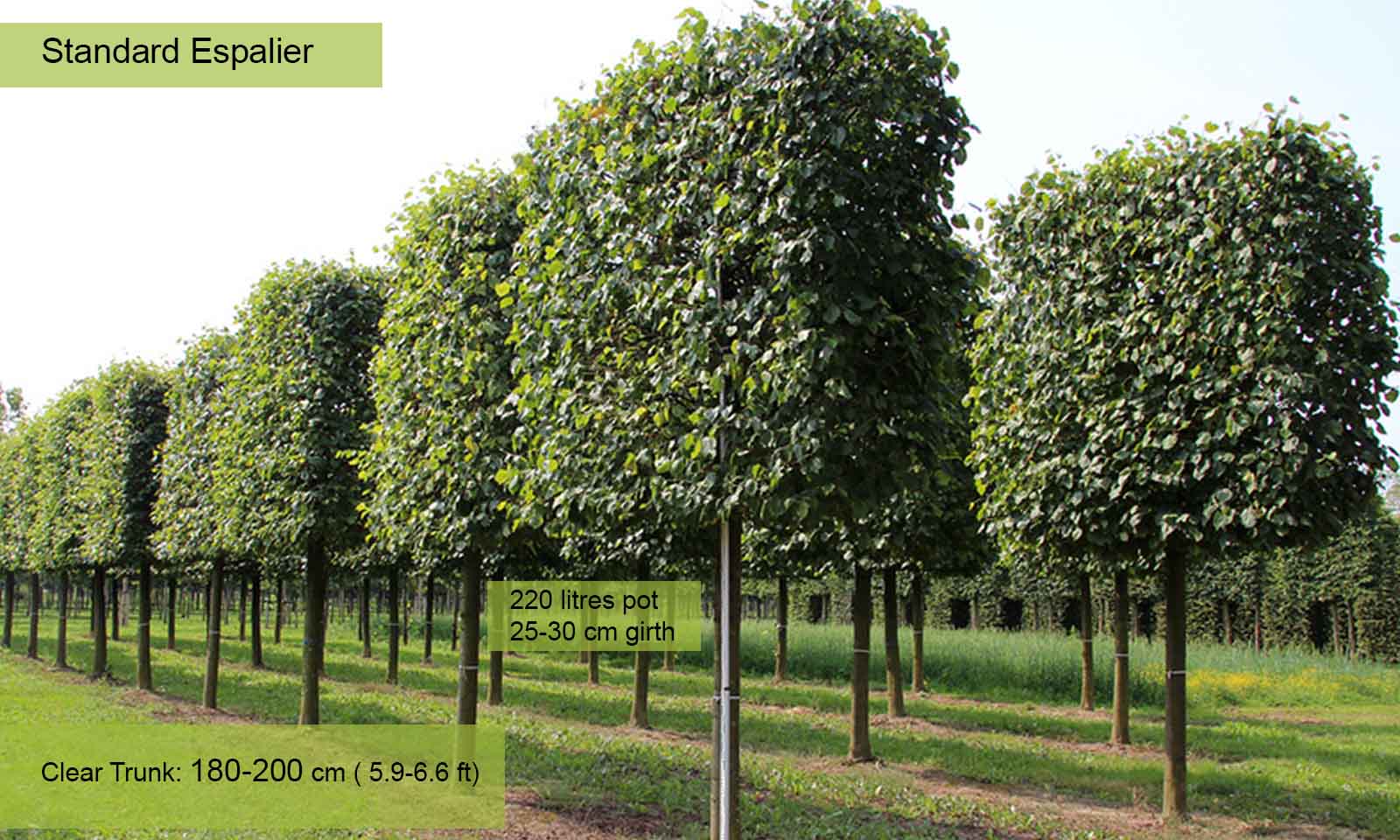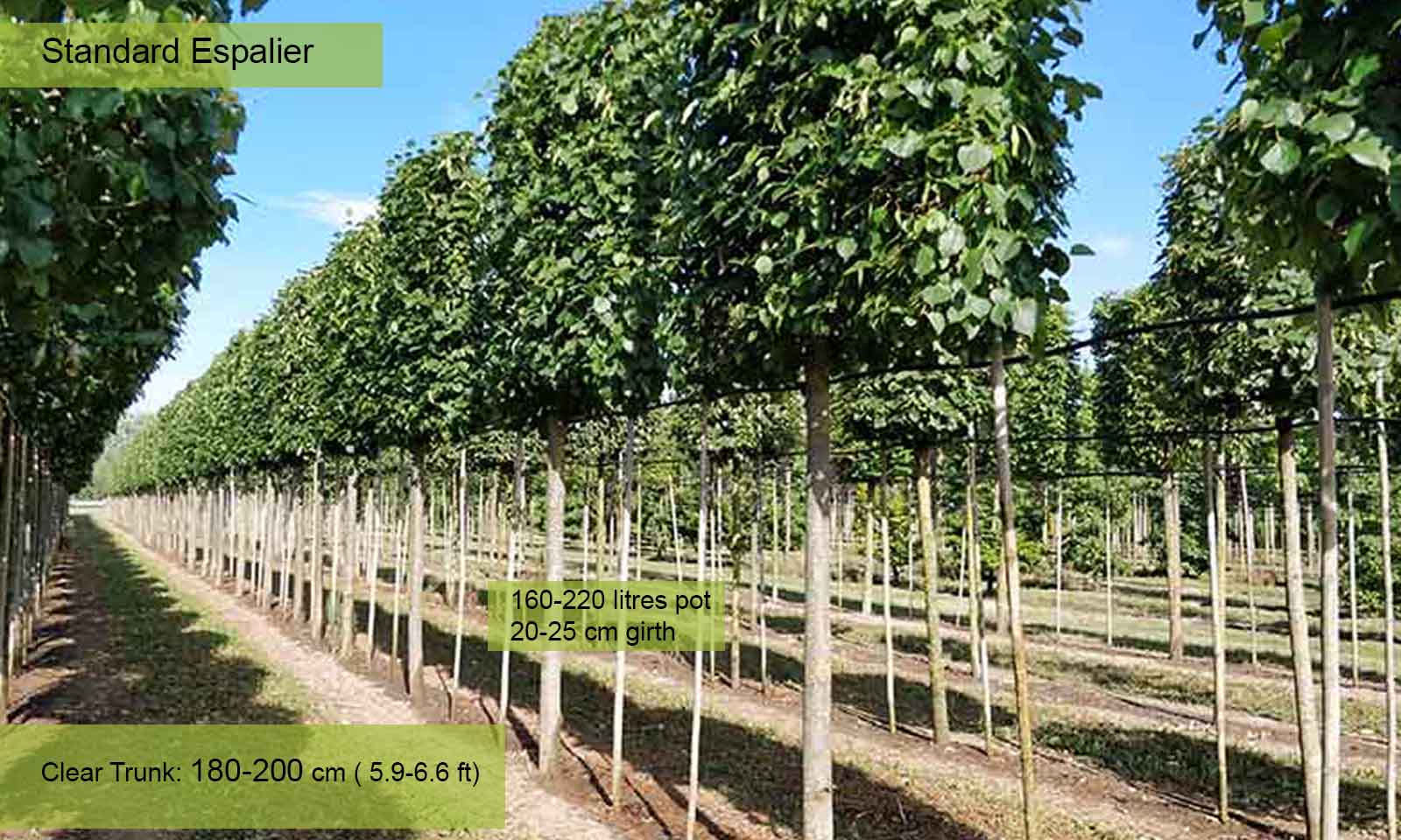 Girth 14-16 cm: 110 litre pot, Trunk – 200 cm (6.6 ft), Trellis – W140 x H120 cm (4.6 x 3.9 ft);