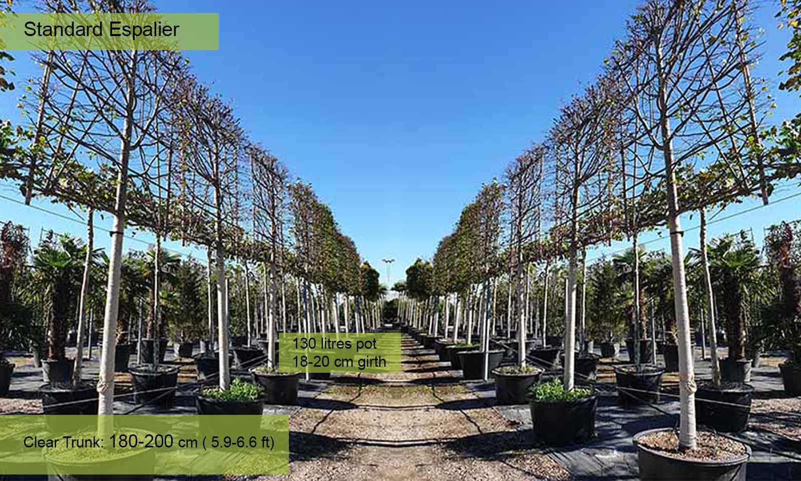 Girth 18-20 cm: 130 litre pot, Trunk – 200 cm (6.6 ft), Trellis – W140 x H120 cm (4.6 x 3.9 ft);