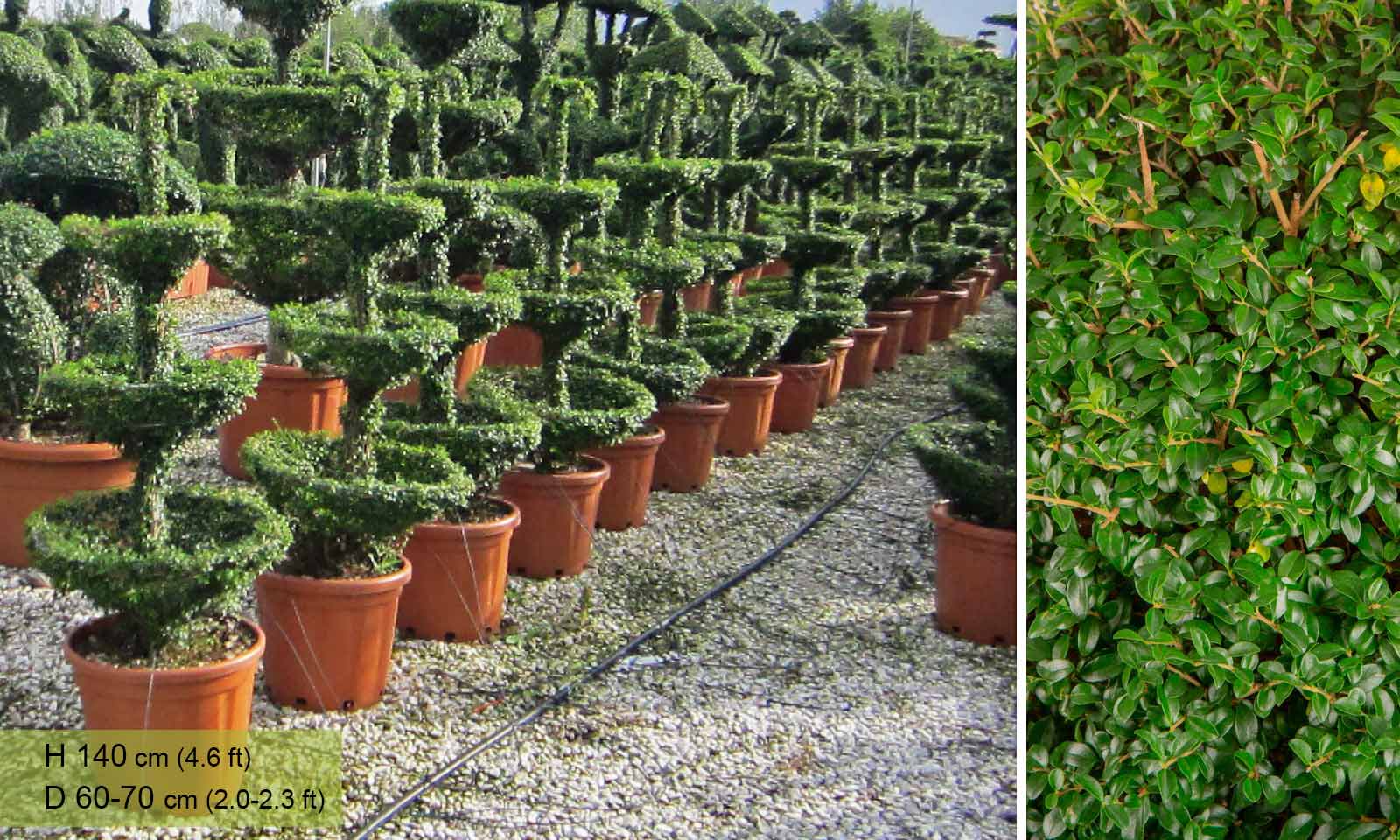 It produces abundant creamy white flowers with a rather unusual scent in late summer and small, black berries in autumn. It needs regular watering three times a week. The Hardiness rating is H6, meaning that it is perfect for the UK climate. Privet grows rapidly and needs clipping every two to three weeks in the summer months. Growth slows down and stops in September, after which the shrub will retain its shape until next spring. All parts of the plant are toxic and may cause severe discomfort if eaten. The soil needs to be well drained and a full sun or partial shade is recommended.