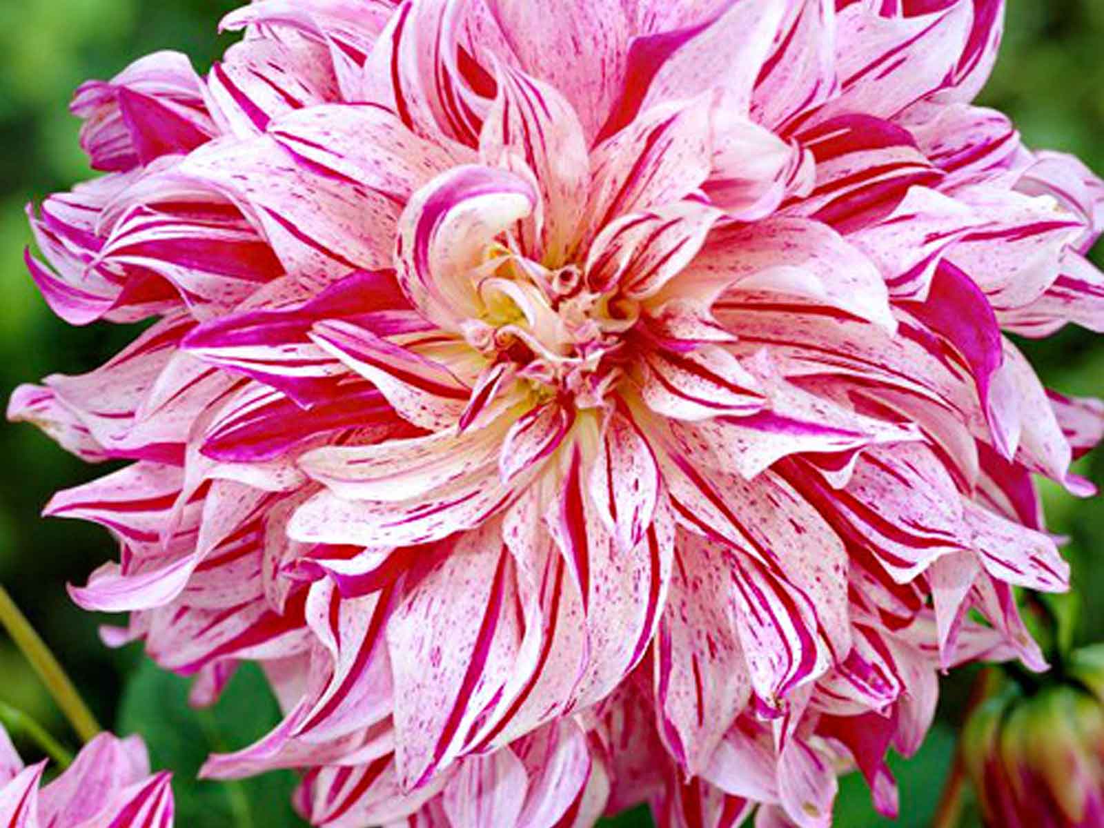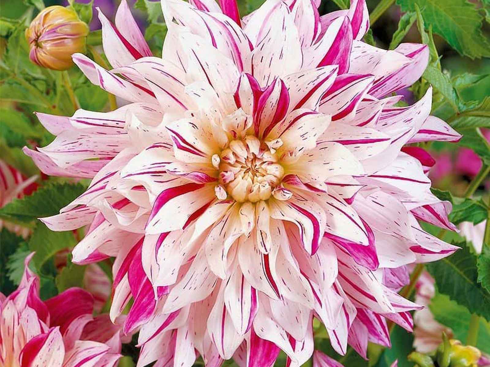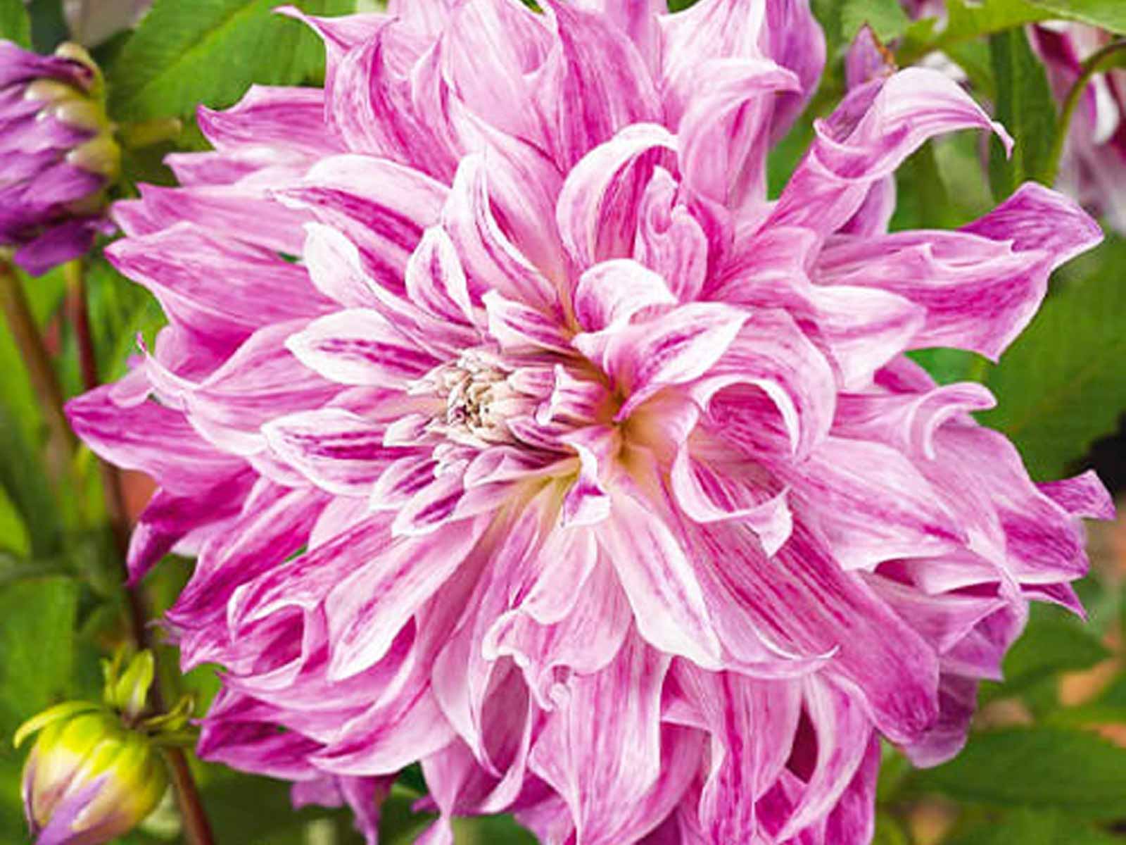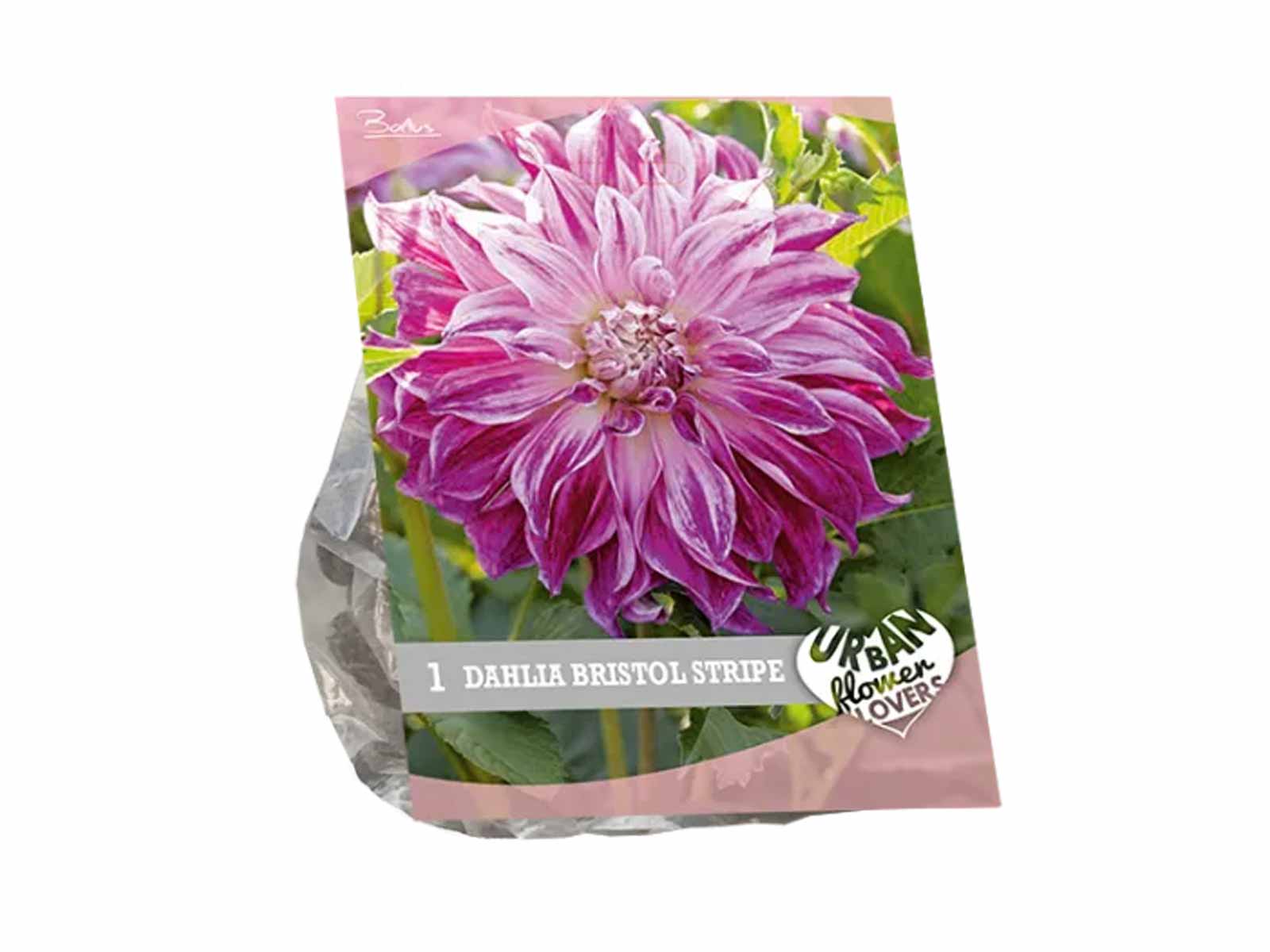 Dahlia ‘Bristol Stripe’ is a captivating variety with unique, candy-striped blooms in shades of soft lavender and white, often streaked with deeper pink or crimson tones. Its full, decorative flowerheads and lush green foliage create a bold and whimsical effect, making it an ideal choice for borders, beds, and cottage-style plantings. This charming dahlia adds both colour and character to any garden display.