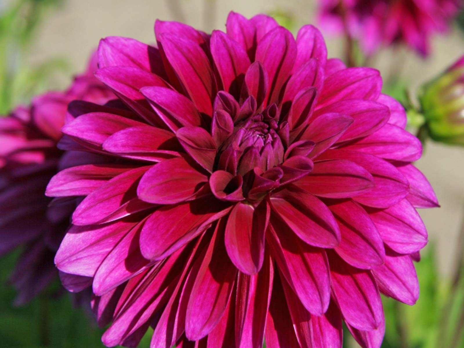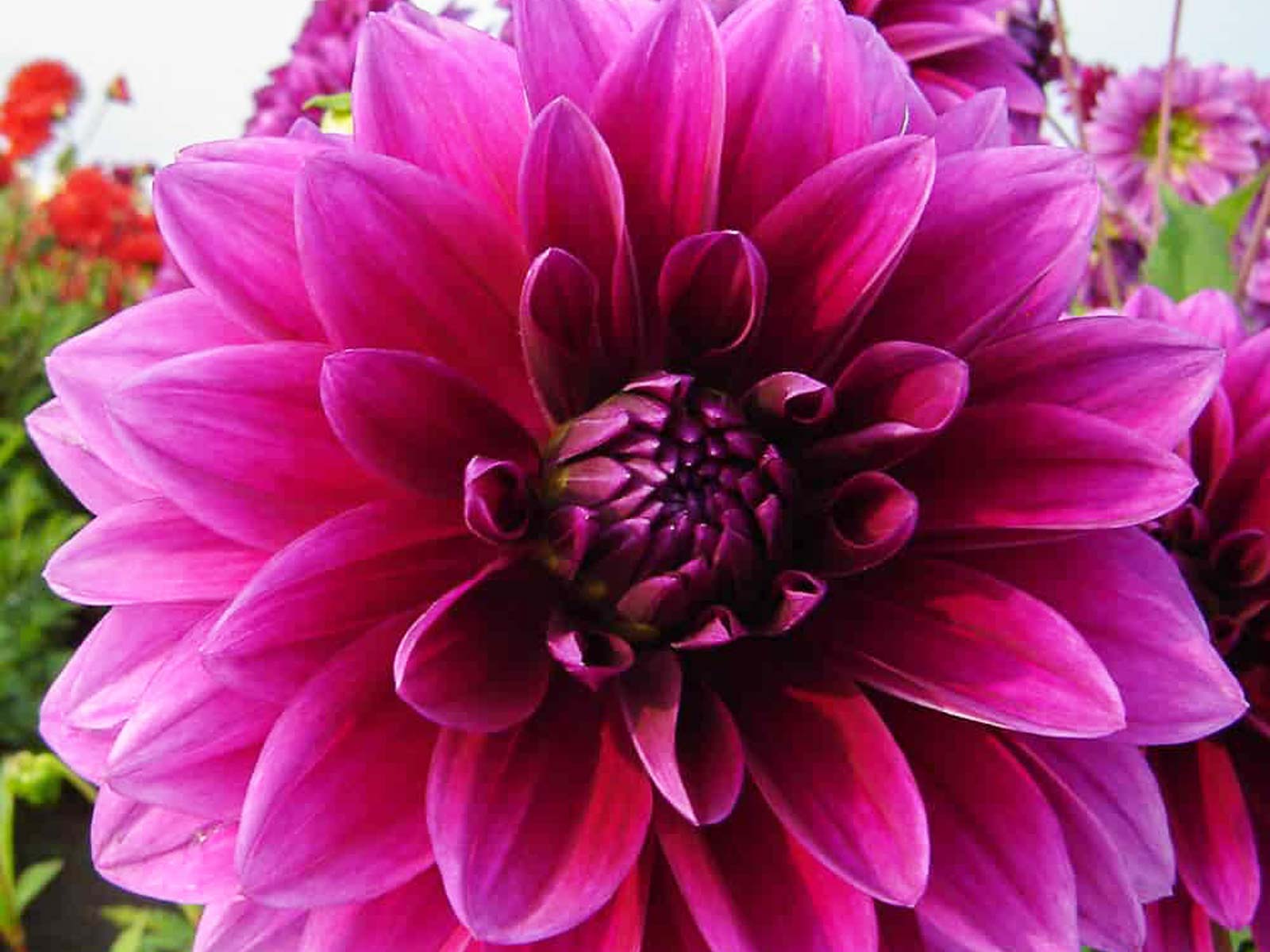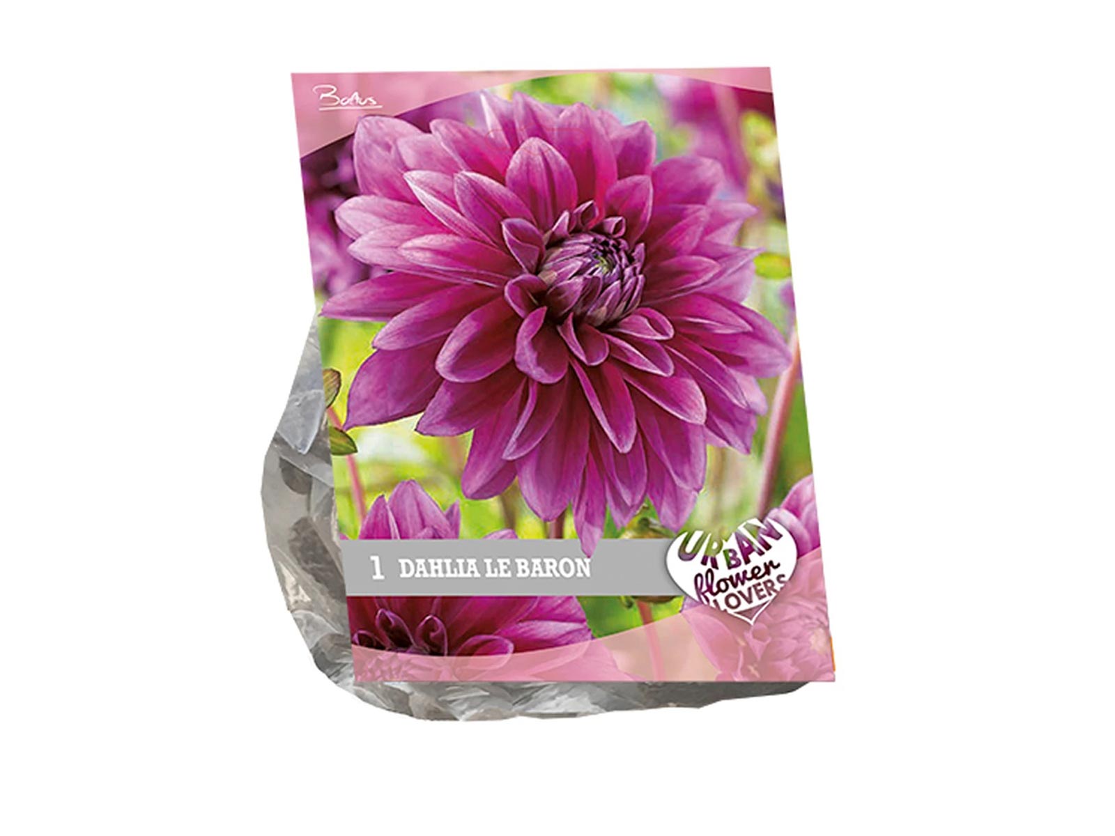 Dahlia ‘Le Baron’ is a bold and elegant variety, showcasing rich, deep burgundy-purple blooms with velvety petals that bring a sense of drama and sophistication to the garden. Its classic decorative form and intense color make it a standout feature in borders, beds, or containers, especially when paired with lighter or contrasting hues.