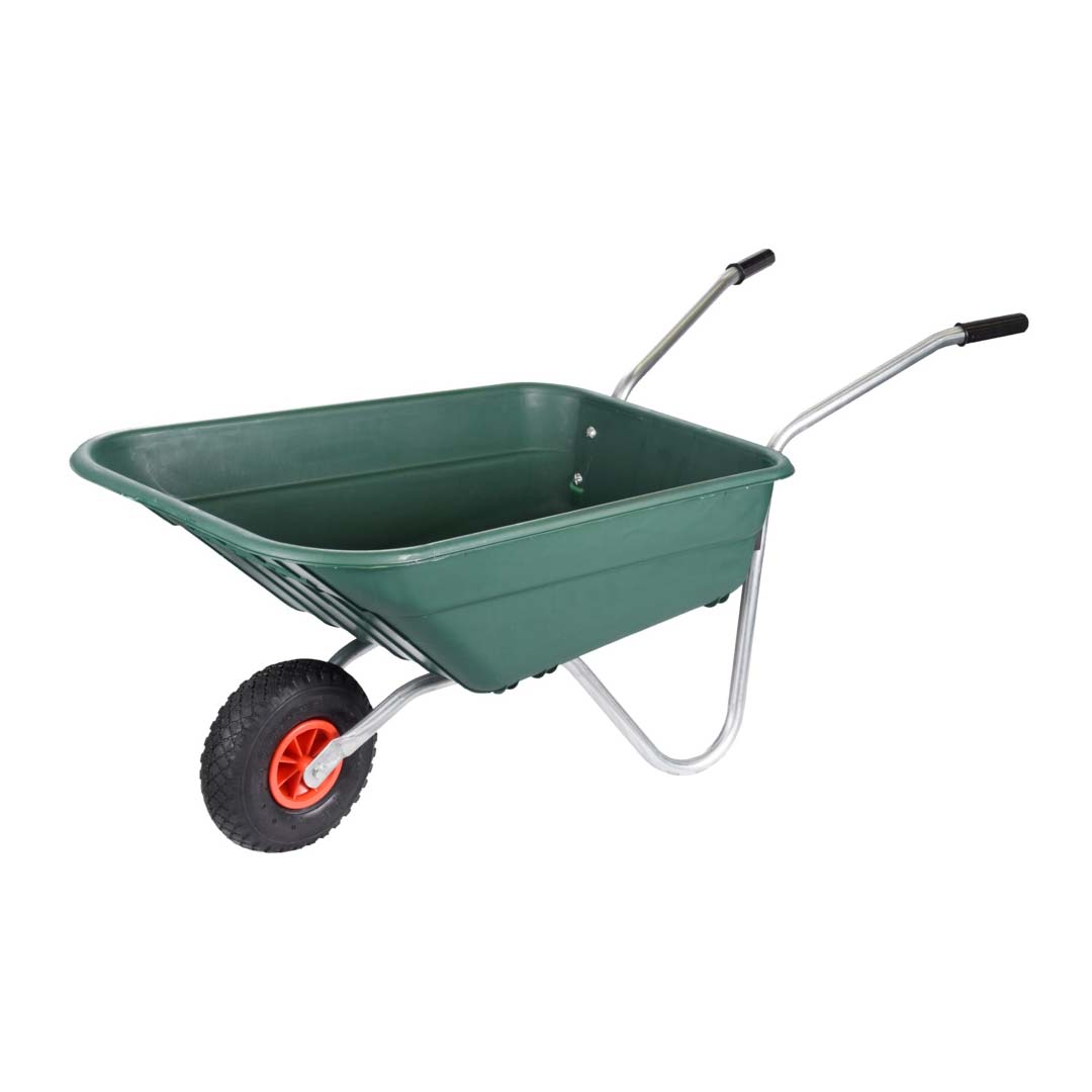 85L poly body and 2 piece galvanised frame with 10in Pneumatic wheel, ideal around the garden