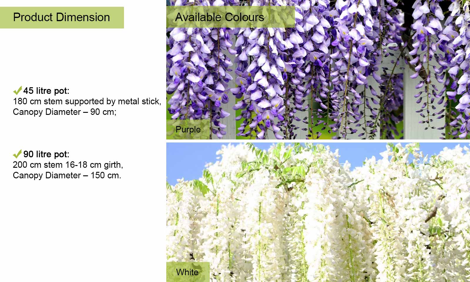 The most common varieties we deliver Wisteria Sinensis Alba, Wisteria Sinensis or Wisteria Floribunda Black Dragon. However, due to the extensive range of Wisteria varieties, we reserve the right to deliver very similar looking variety to fulfil your order as long as we match selected Wisteria colour and selected size. If you would like specific variety of Wisteria to match an existing variety in your garden or if you selecting specific variety, please contact us prior to order to check availability of that specific variety of Wisteria plant in required size.