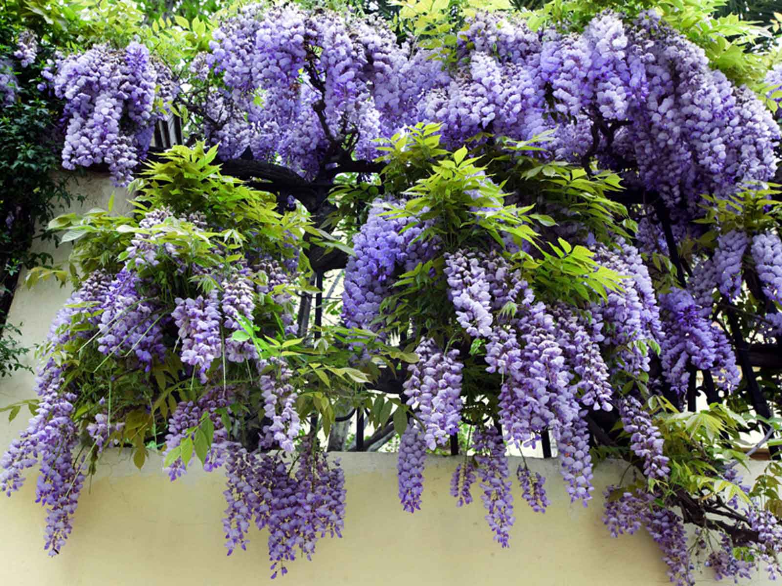Wisteria Sinensis, Chinese Wisteria, is a much-loved beautiful climber from the Far East renowned for amazing beautiful cascades of gloriously scented racemes of lavender or white flowers in spring and early summer arising from bare stems as leaves do not appear until blossoming is over. Flowering is followed by pale green divided leaves which turn yellow in the autumn.